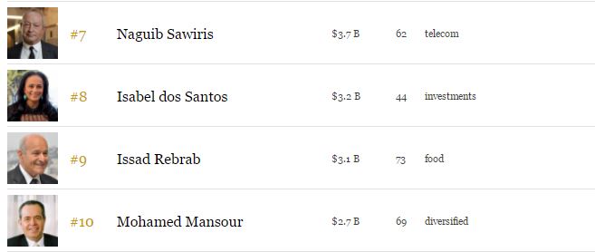 Egypt’s richest billionaire is Nassef Sawiris, whose $5.3 billion fortune is up $400 million since November 2015. Sawiris runs OCI, one of the world’s largest nitrogen fertilizers. The country’s next richest person is his brother Naguib Sawiris, who was Egypt’s biggest gainer on the list. His net worth increased $700 million to $3.7 billion. In December 2016, Naguib Sawiris announced that he would be stepping down as CEO of his telecom company, Orasom Telecom Media & Technology.